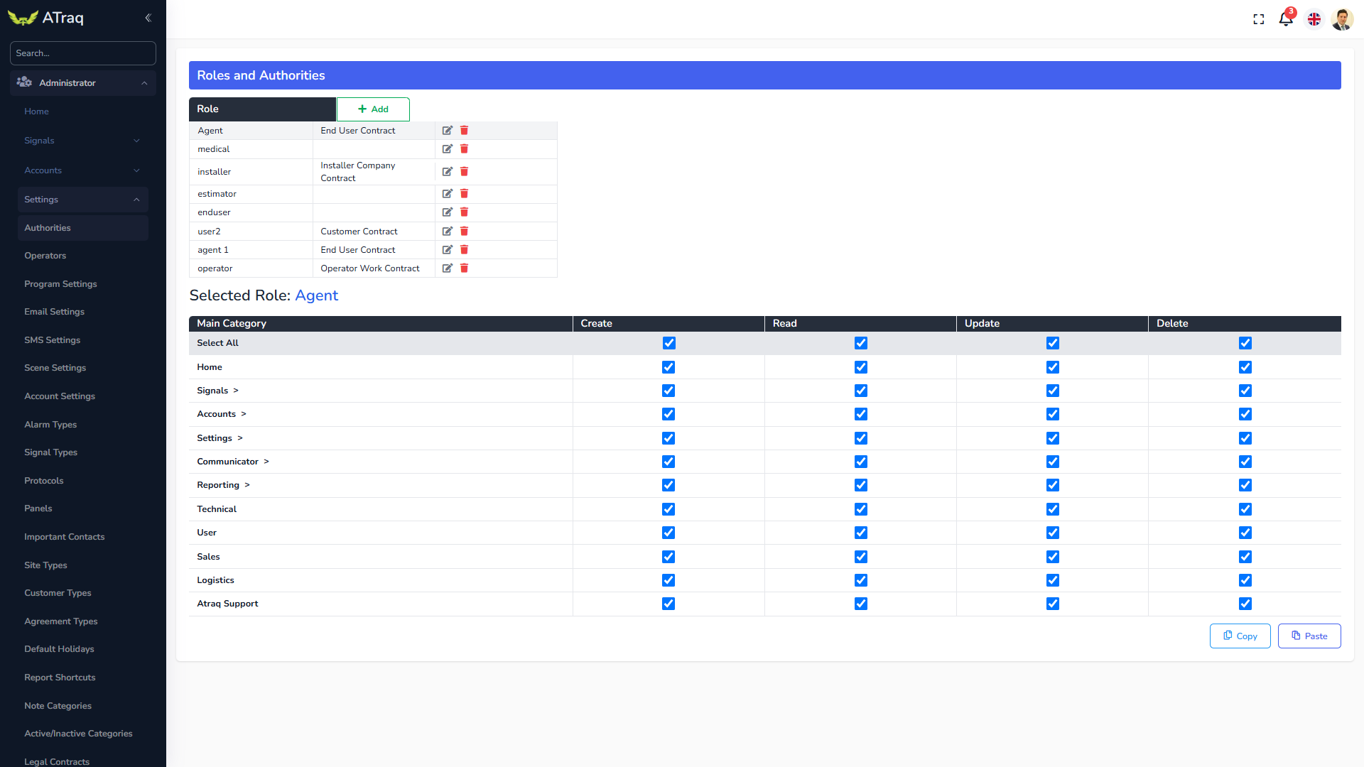 The Authorities screen is to determine the authorities given to each personnel groups. Unlike in Atraq Desktop, we are now creating a Role and assigning this role to the contact. If they are to be an operator and technician for example, they can access the details of both roles simultaneously.